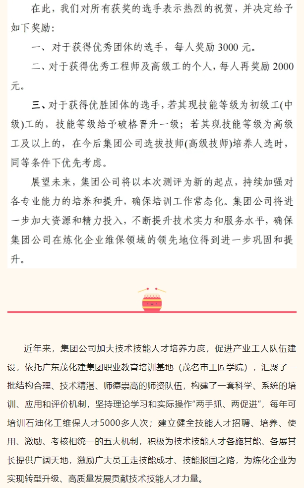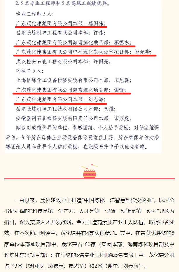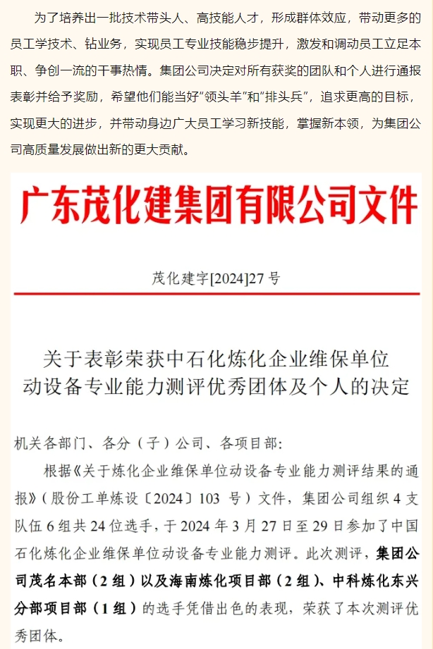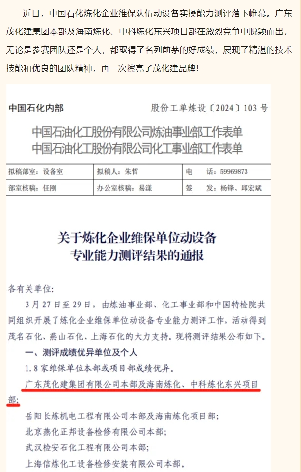 祝賀!茂化建在中石化煉化企業維保隊伍動設備實操能力測評中成績優異,名列前茅