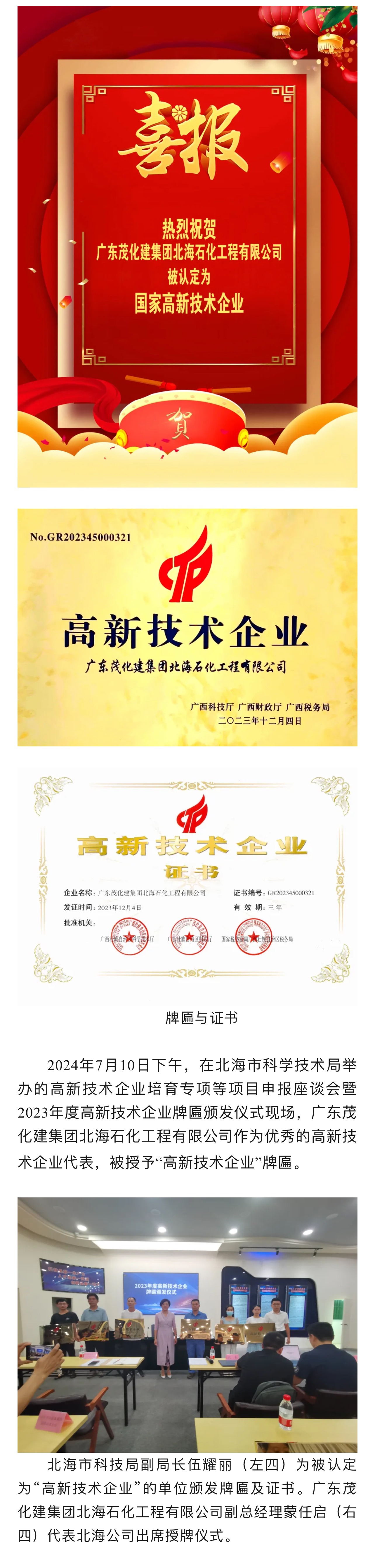 喜報|廣東茂化建集團北海石化工程有限公司 躋身“國家高新技術企業”行列