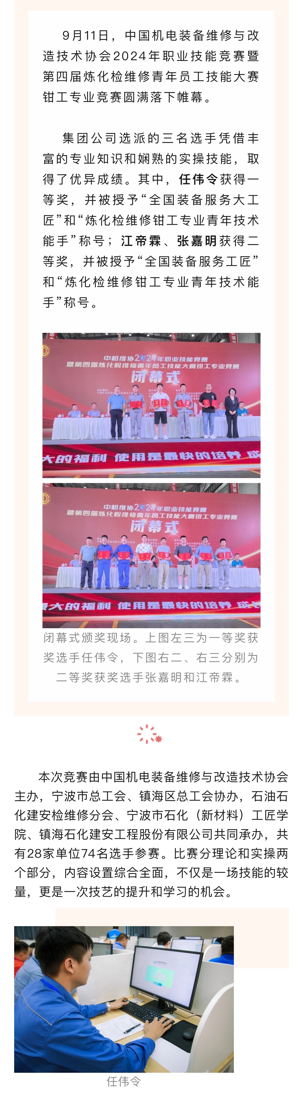 喜報:集團公司在中機維協2024年職業技能競賽暨第四屆煉化檢維修青年員工技能大賽
