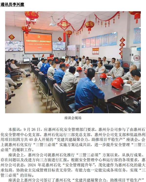 惠州分公司與業(yè)主開(kāi)展 “黨建共建凝聚合力,助推項(xiàng)目平穩(wěn)生產(chǎn)”座談會(huì)