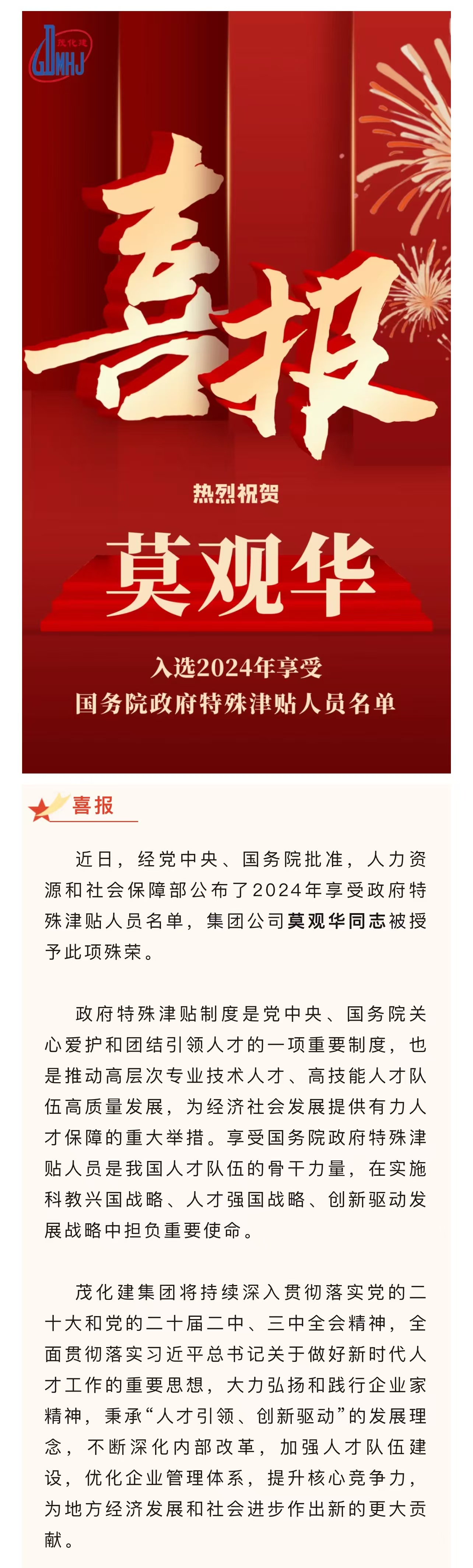 喜報:莫觀華入選享受國務院政府特殊津貼人員名單