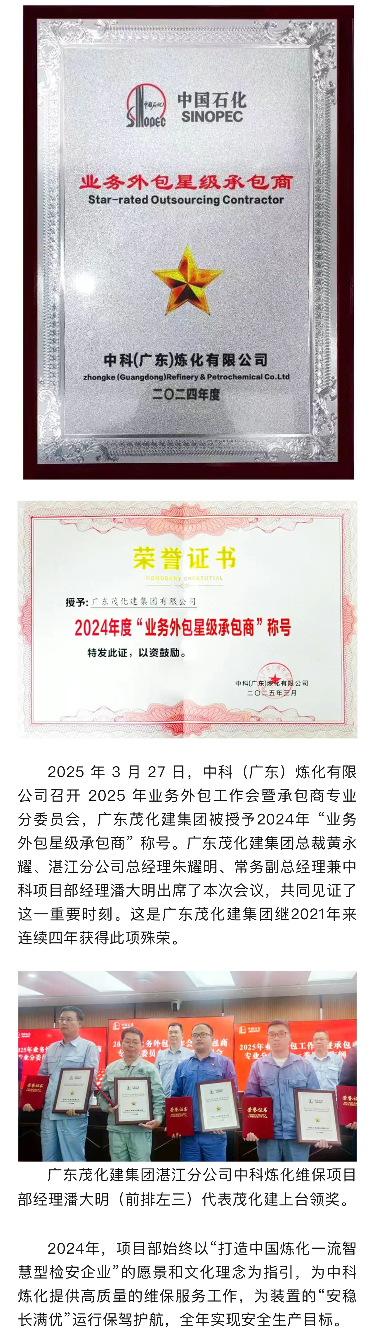 喜報|榮獲2024年中科煉化 “業務外包星級承包商”稱號