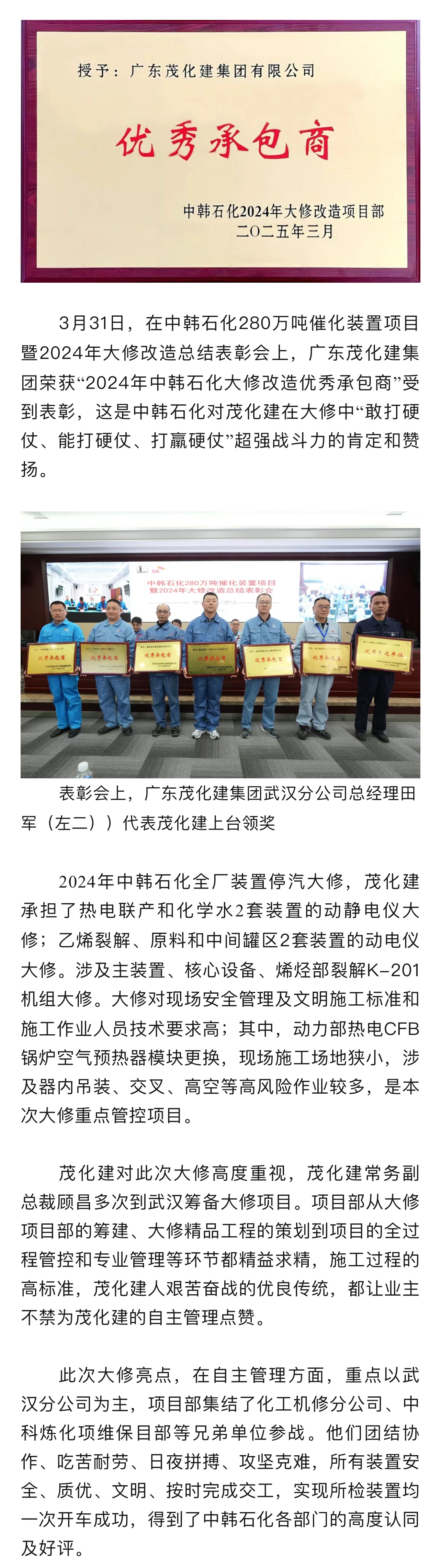 喜報|榮獲中韓石化2024年大修改造 “優秀承包商”稱號
