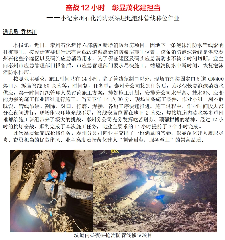 記泰州石化消防泵站埋地泡沫管線移位作業